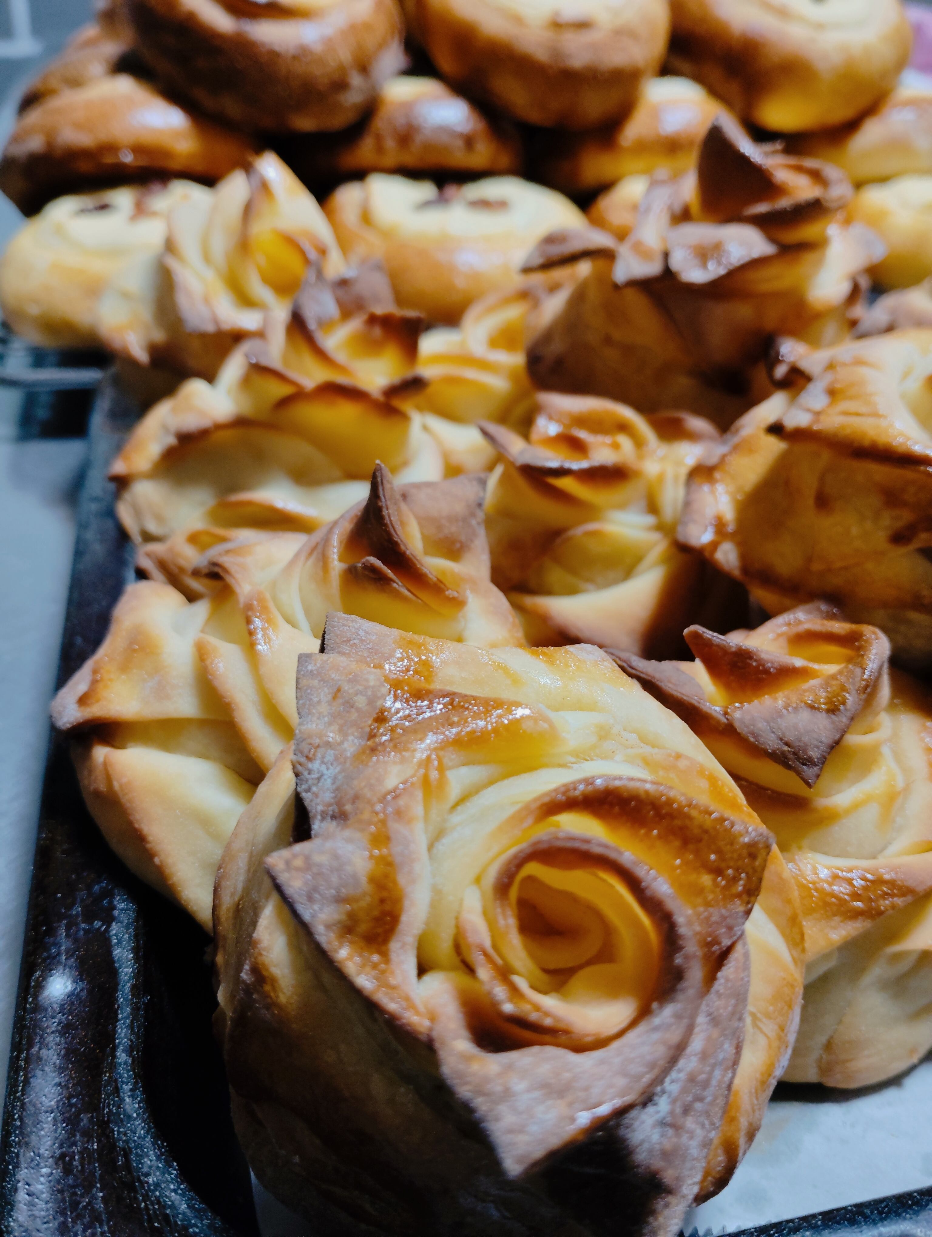 香り高いジャムを入れ、バラの形に巻いたロールパンです。